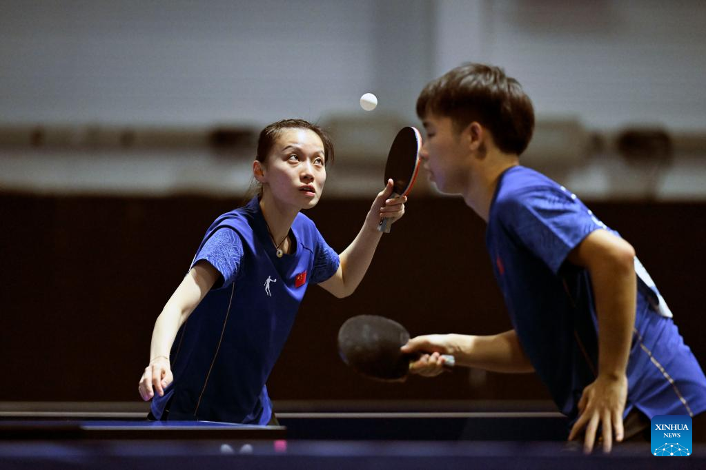 Zeng Beixun/Han Feier (L) of China compete during the table tennis mixed doubles quarterfinal match against Feng Yi-hsin/Tsai Yun-en of Chinese Taipei at the Rhine-Ruhr 2025 FISU World University Games in Essen, Germany, July 21, 2025. (Xinhua/Lian Yi)