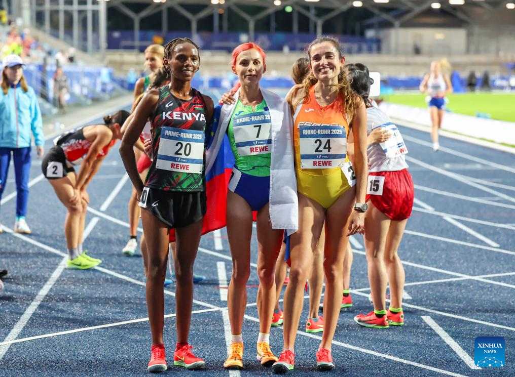 (250722) -- BOCHUM, July 22, 2025 (Xinhua) -- Gold medalist Klara Lukan (front C) of Slovenia, silver medalist Sarah Wanjiru Njeri (front L) of Kenya and bronze medalist Alicia Berzosa Martin (front R) of Spain pose for photos after the women's 10000m final at the Rhine-Ruhr 2025 FISU World University Games in Bochum, Germany, July 21, 2025. (Xinhua/Zhang Fan)