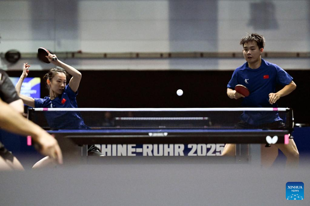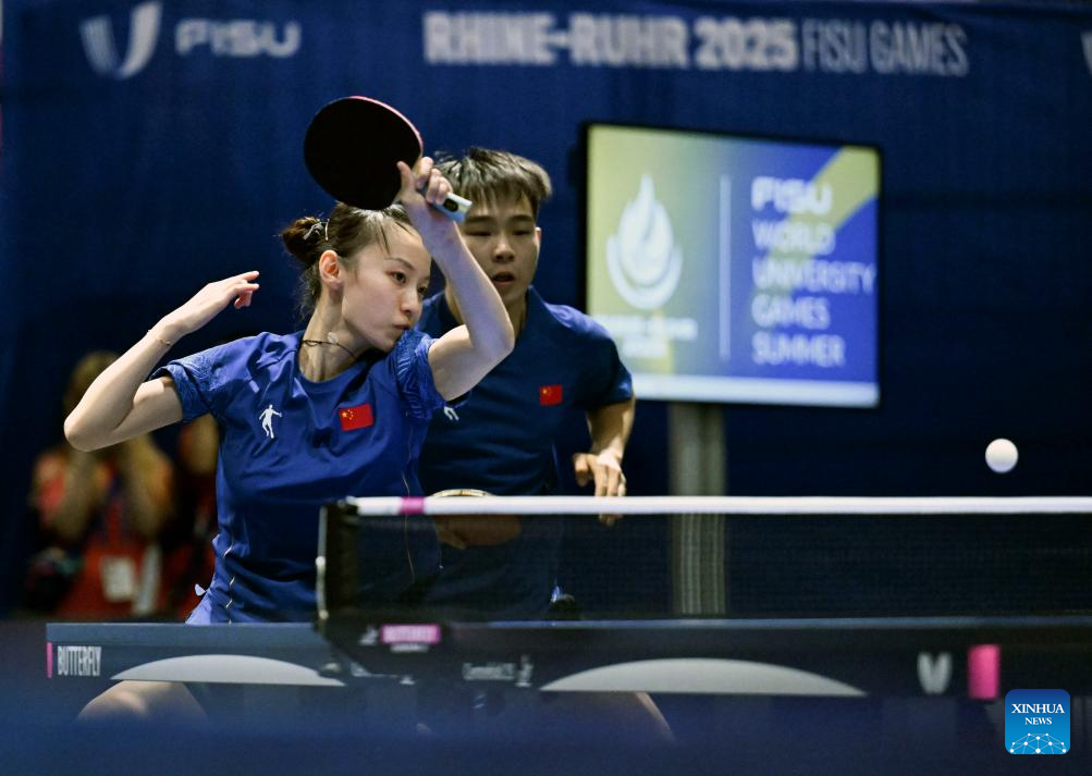 Zeng Beixun (R)/Han Feier of China compete during the table tennis mixed doubles quarterfinal match against Feng Yi-hsin/Tsai Yun-en of Chinese Taipei at the Rhine-Ruhr 2025 FISU World University Games in Essen, Germany, July 21, 2025. (Xinhua/Lian Yi)