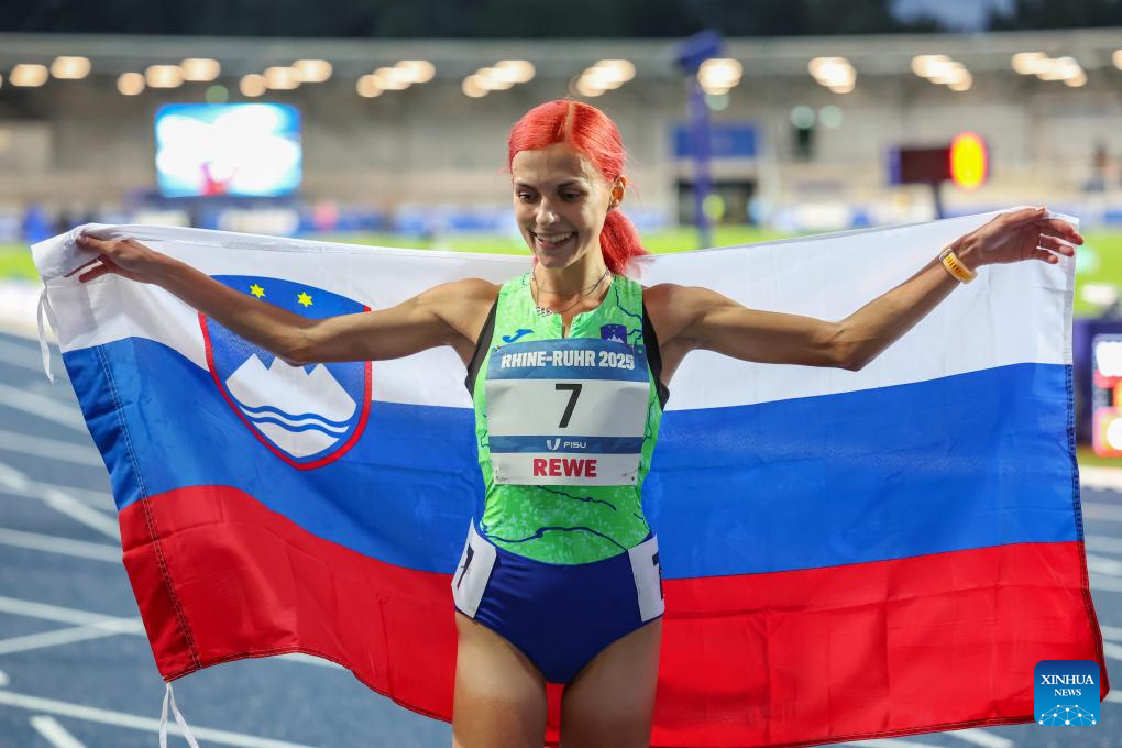 (250722) -- BOCHUM, July 22, 2025 (Xinhua) -- Gold medalist Klara Lukan of Slovenia poses for photos with national flag after the women's 10000m final at the Rhine-Ruhr 2025 FISU World University Games in Bochum, Germany, July 21, 2025. (Xinhua/Zhang Fan)