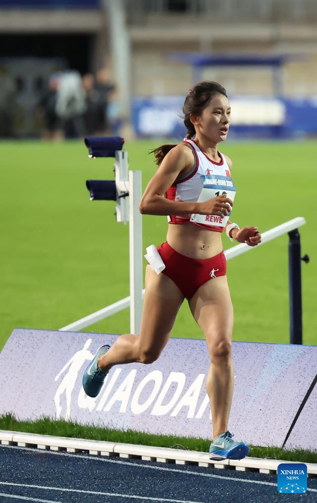 (250722) -- BOCHUM, July 22, 2025 (Xinhua) -- Ma Xiuzhen of China competes during the women's 10000m final at the Rhine-Ruhr 2025 FISU World University Games in Bochum, Germany, July 21, 2025. (Xinhua/Zhang Fan)