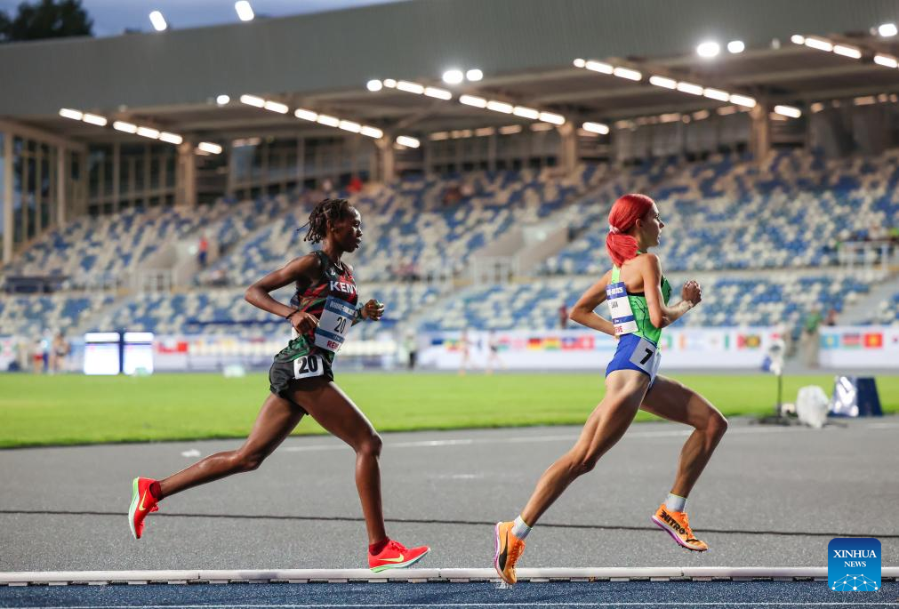 (250722) -- BOCHUM, July 22, 2025 (Xinhua) -- Klara Lukan (R) of Slovenia and Sarah Wanjiru Njeri of Kenya compete during the women's 10000m final at the Rhine-Ruhr 2025 FISU World University Games in Bochum, Germany, July 21, 2025. (Xinhua/Zhang Fan)