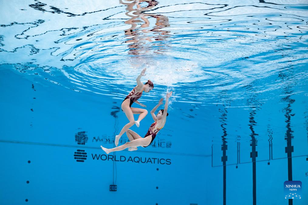 Lin Yanhan/Lin Yanjun of China perform during the women's duet technical final of artistic swimming at the World Aquatic Championships in Singapore, July 21, 2025. (Xinhua/Xia Yifang)