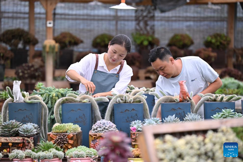Liu Lin (L) and her husband take care of potted succulent plants at the planting base of her company in Zhouning County, southeast China's Fujian Province, July 19, 2025. (Xinhua/Jiang Kehong)