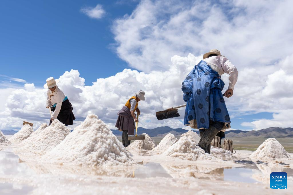 Herdsmen harvest salt in Gegye County of Ngari Prefecture, southwest China's Xizang Autonomous Region, July 20, 2025. (Xinhua/Tenzing Nima Qadhup)