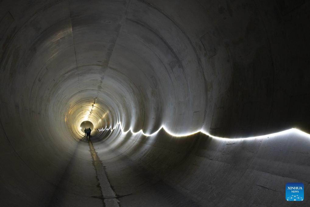 Construction workers inspect in the Lower Intake pipeline of the Polihali Transfer Tunnel Project in Mokhotlong District, eastern Lesotho, July 6, 2025. (Xinhua/Yang Guang)
