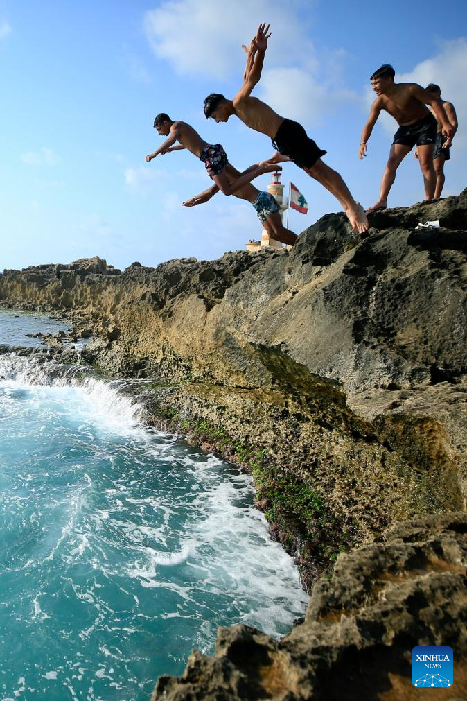 People dive into the sea off the coast of Sidon, Lebanon, July 20, 2025. (Photo by Ali Hashisho/Xinhua)
