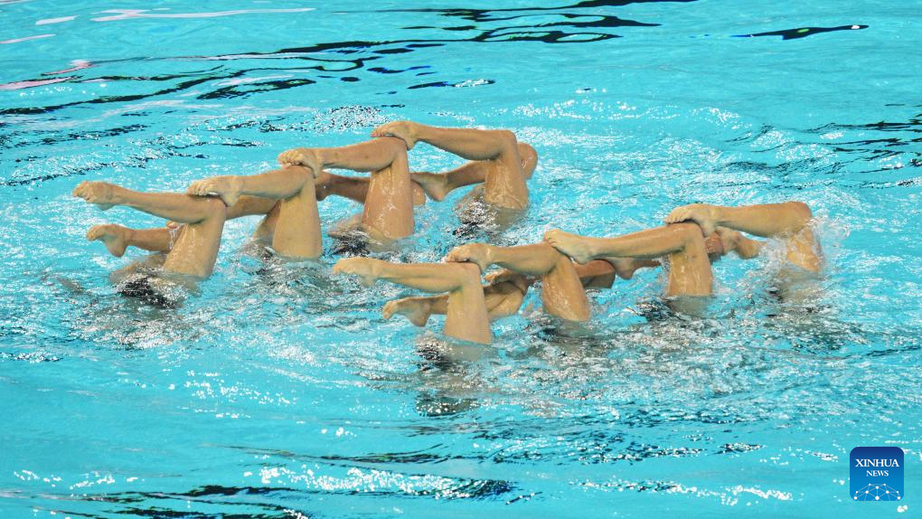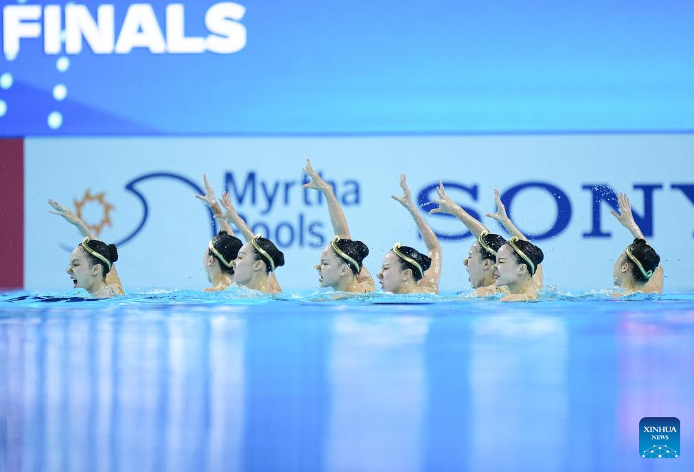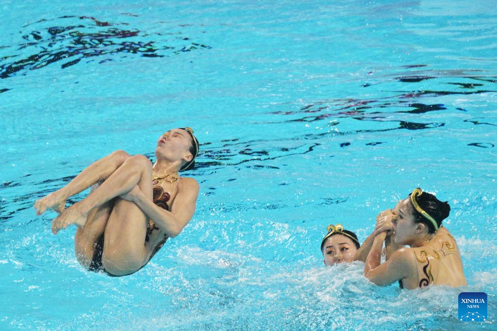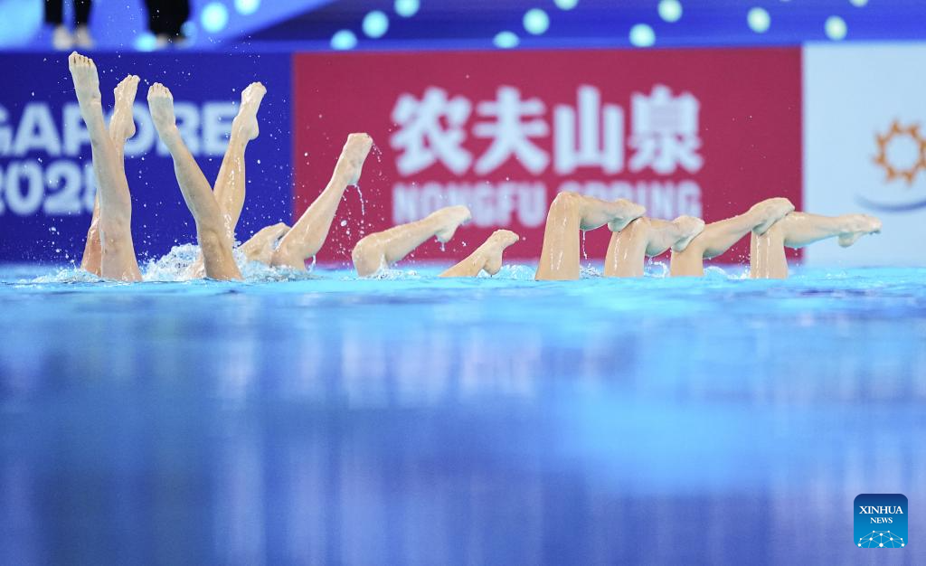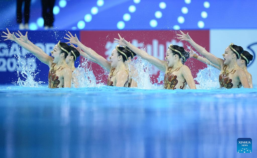 Team China compete during the team technical final of artistic swimming at the World Aquatics Championships in Singapore, July 22, 2025. (Xinhua/Xia Yifang)