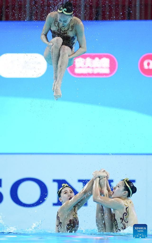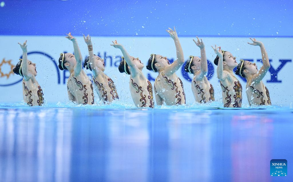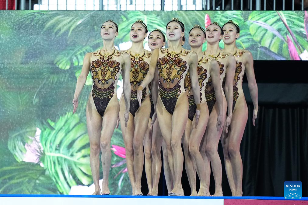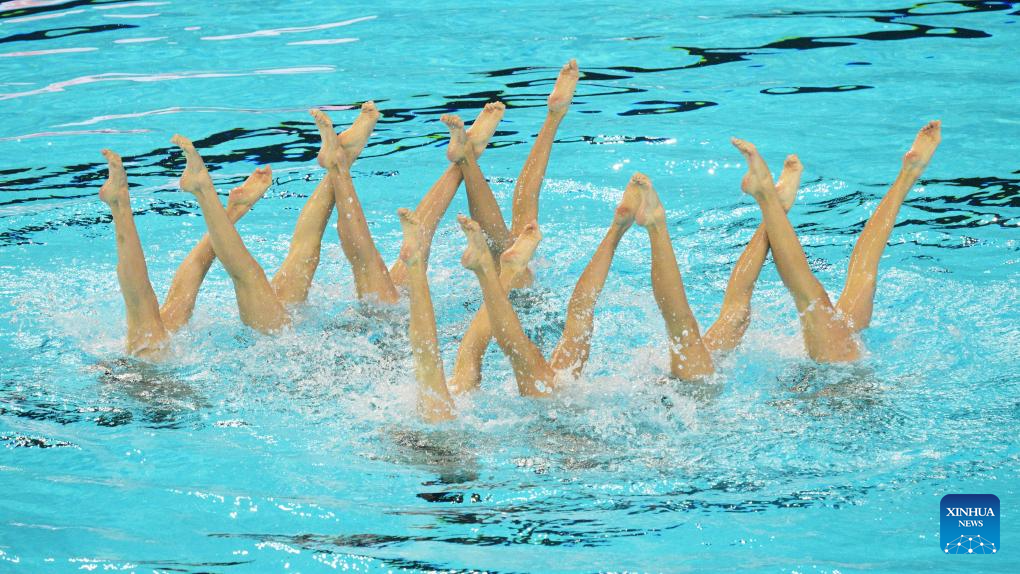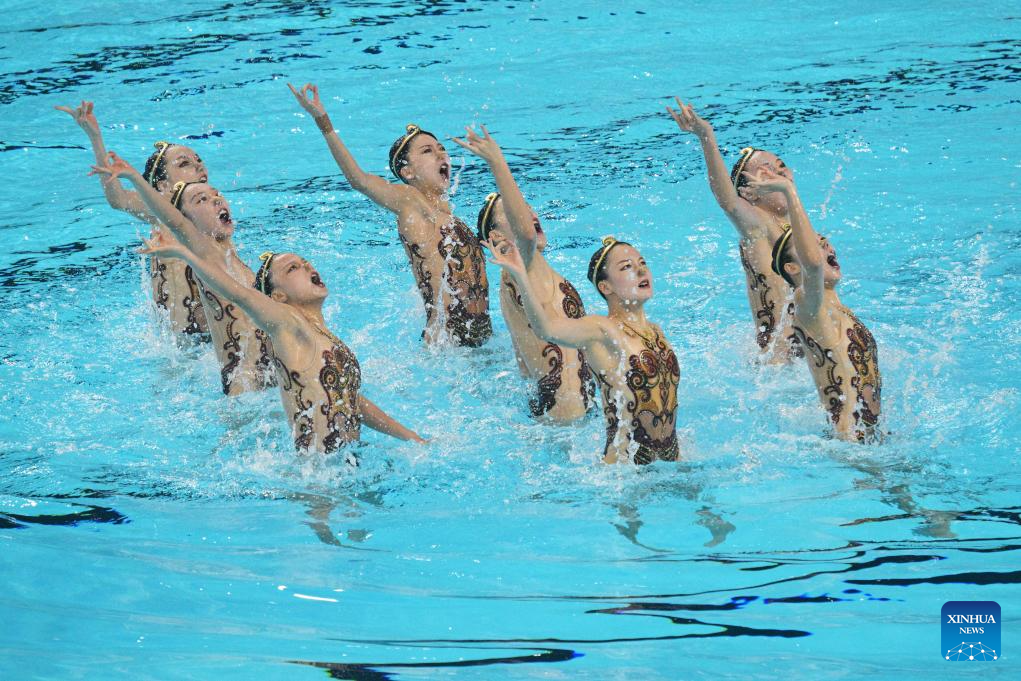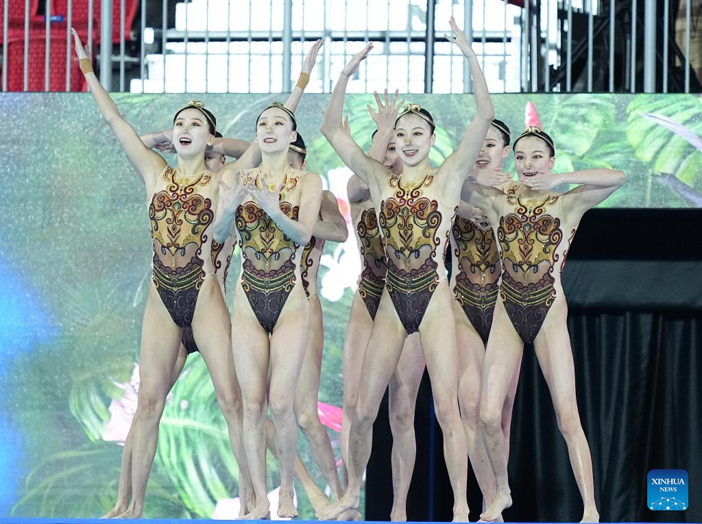 Team China compete during the team technical final of artistic swimming at the World Aquatics Championships in Singapore, July 22, 2025. (Xinhua/Xia Yifang)