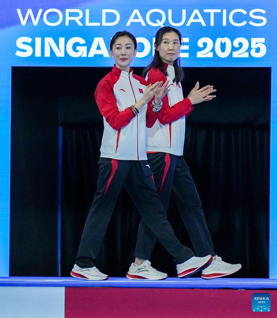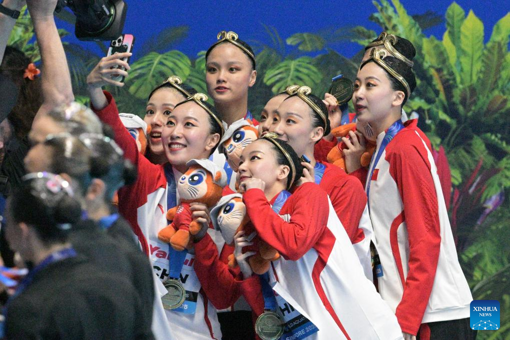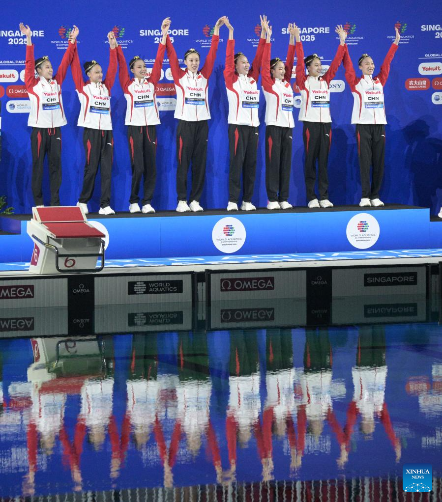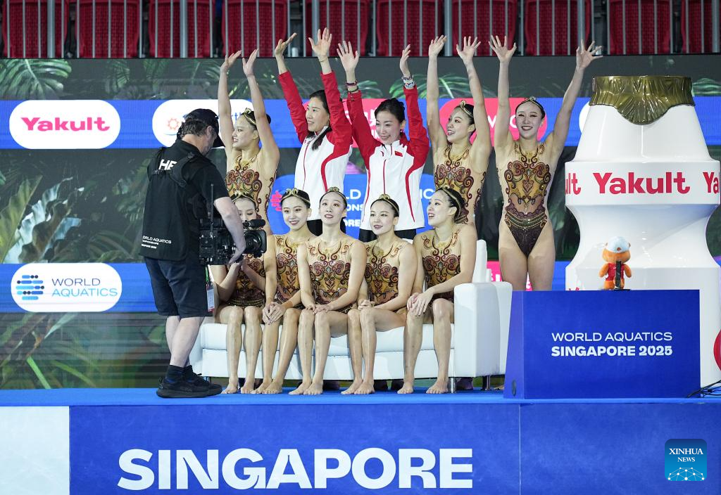 Members of team China react after the awarding ceremony for the team technical of artistic swimming at the World Aquatics Championships in Singapore, July 22, 2025. (Xinhua/Xia Yifang)