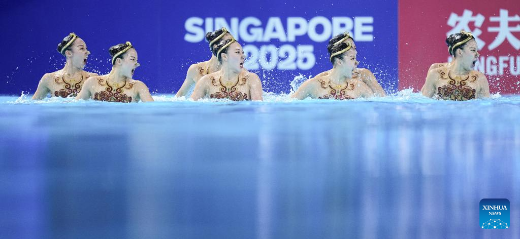Team China perform during the team technical final of artistic swimming at the World Aquatics Championships in Singapore, July 22, 2025. (Xinhua/Xia Yifang)