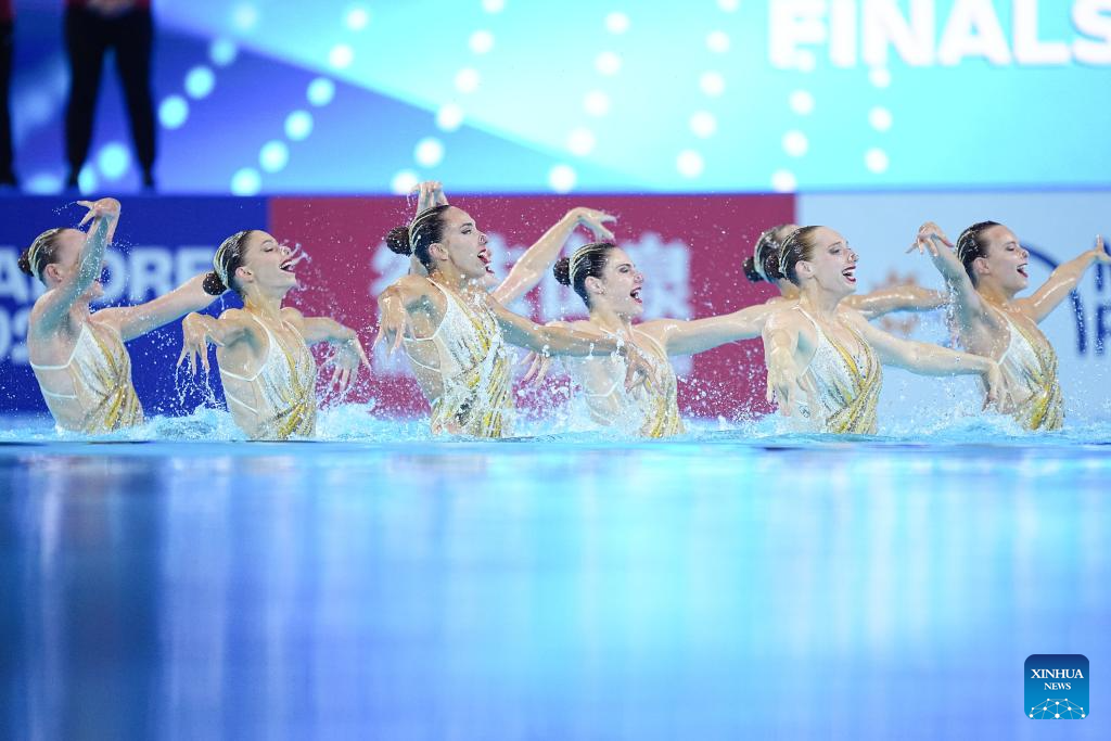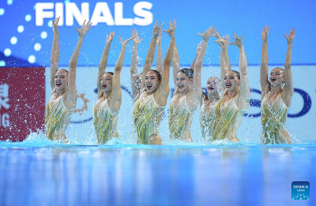 Team Canada perform during the team technical final of artistic swimming at the World Aquatics Championships in Singapore, July 22, 2025. (Xinhua/Xia Yifang)