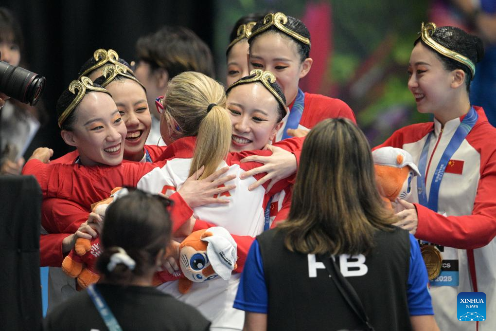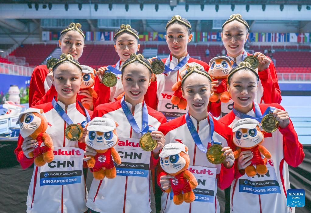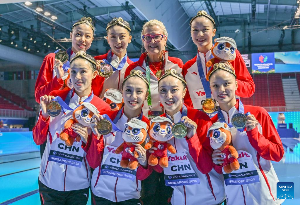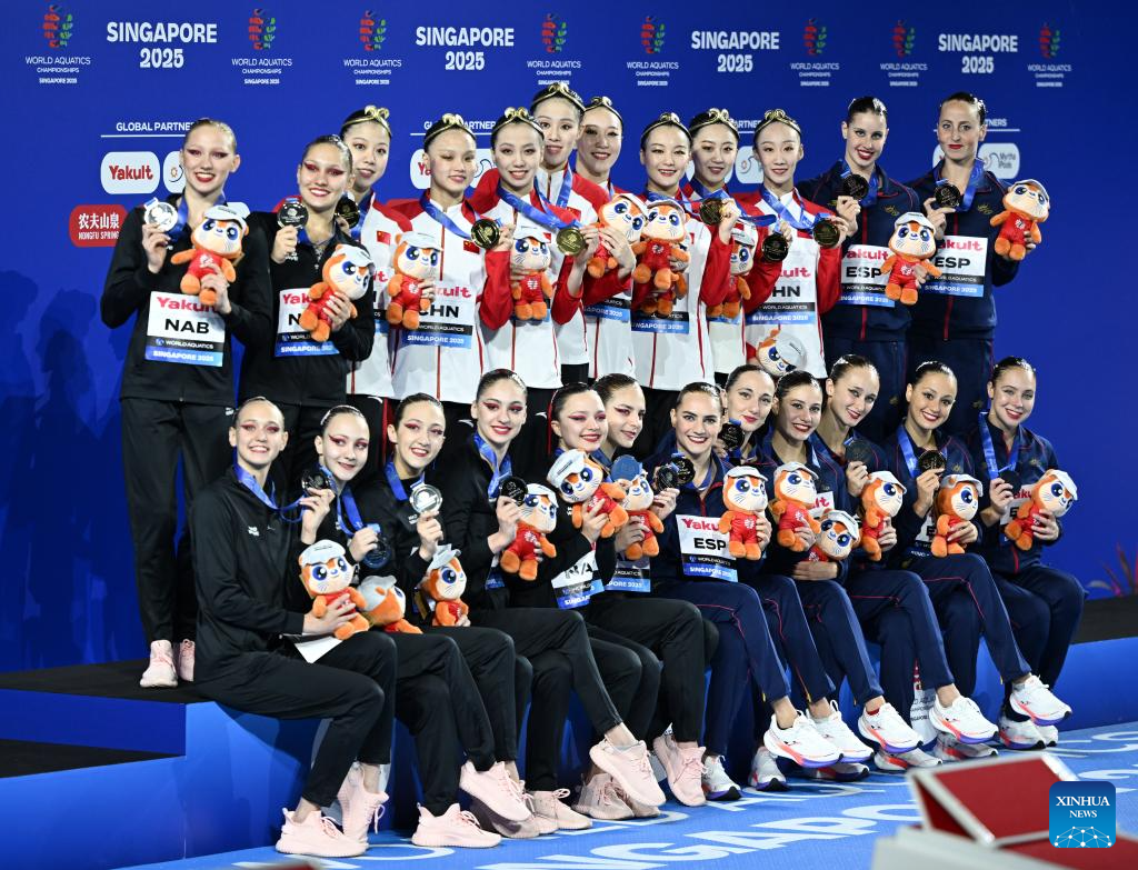 Gold medalists team China react after the awarding ceremony for the team technical of artistic swimming at the World Aquatics Championships in Singapore, July 22, 2025. (Xinhua/Xia Yifang)