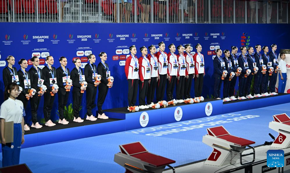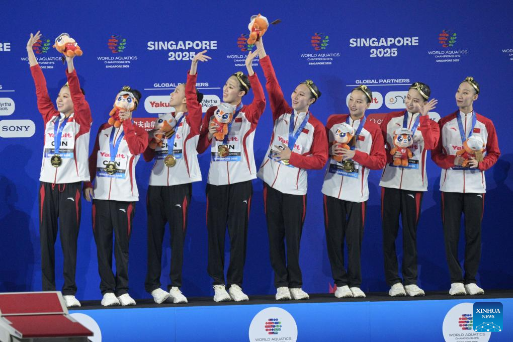 Gold medalists team China (C) react during the awarding ceremony for the team technical of artistic swimming at the World Aquatics Championships in Singapore, July 22, 2025. (Xinhua/Xia Yifang)