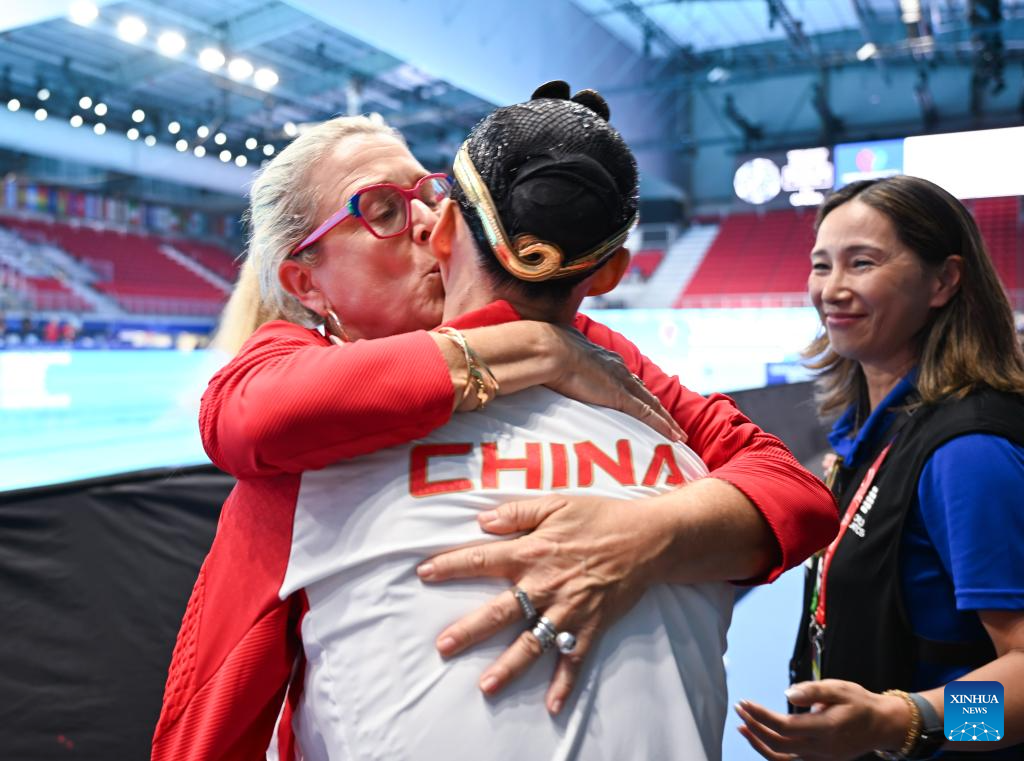 Team China's coach Ana Tarres Campa (L) reacts after the awarding ceremony for the team technical of artistic swimming at the World Aquatics Championships in Singapore, July 22, 2025. (Xinhua/Xia Yifang)