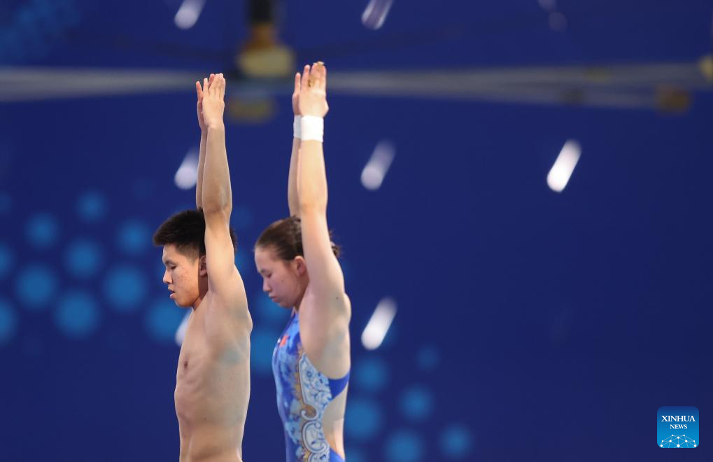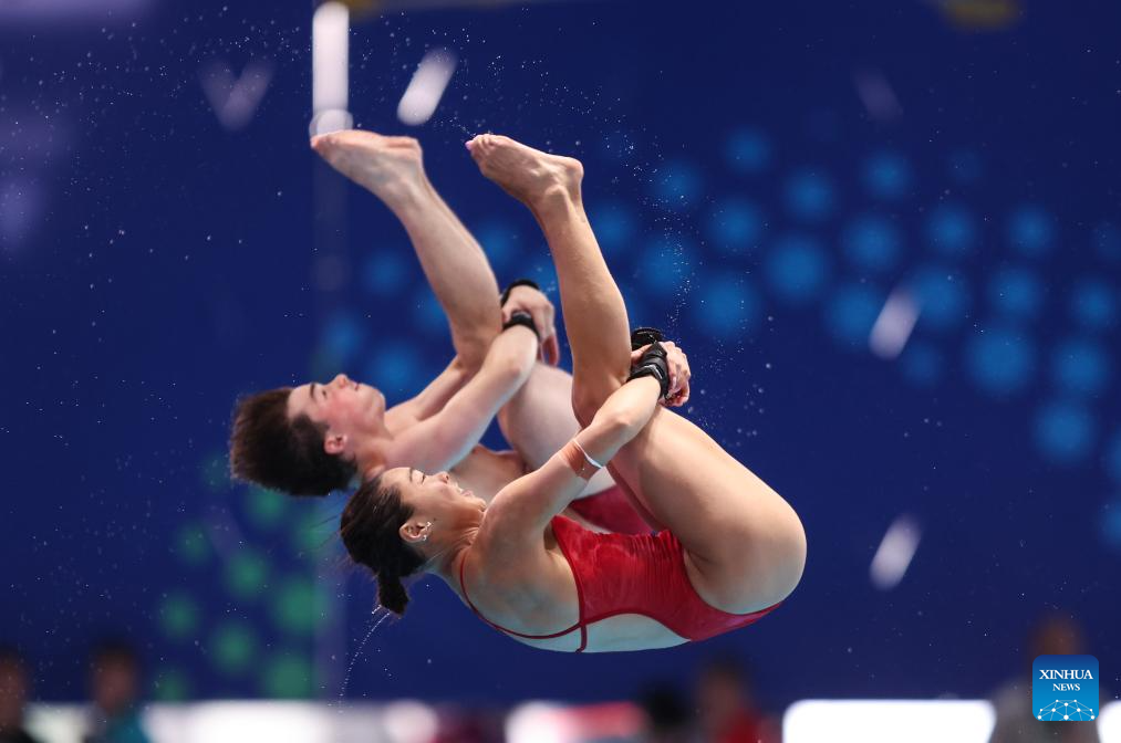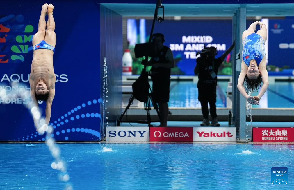 Cheng Zilong (L)/Chen Yiwen of China compete during mixed 3m & 10m team final of diving at the World Aquatics Championships in Singapore, July 26, 2025. (Xinhua/Xue Yuge)