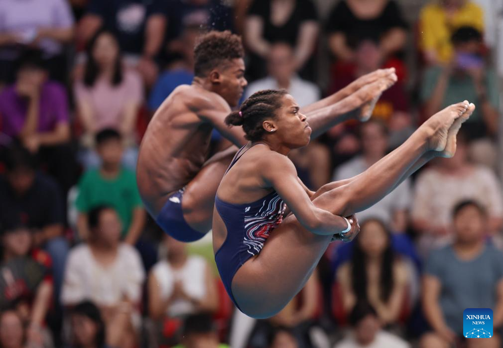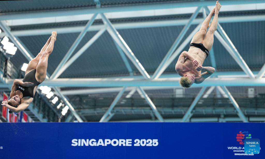 Jack Ryan (R) /Sophia Verzyl of the United States compete during mixed 3m & 10m team final of diving at the World Aquatics Championships in Singapore, July 26, 2025. (Xinhua/Xue Yuge)