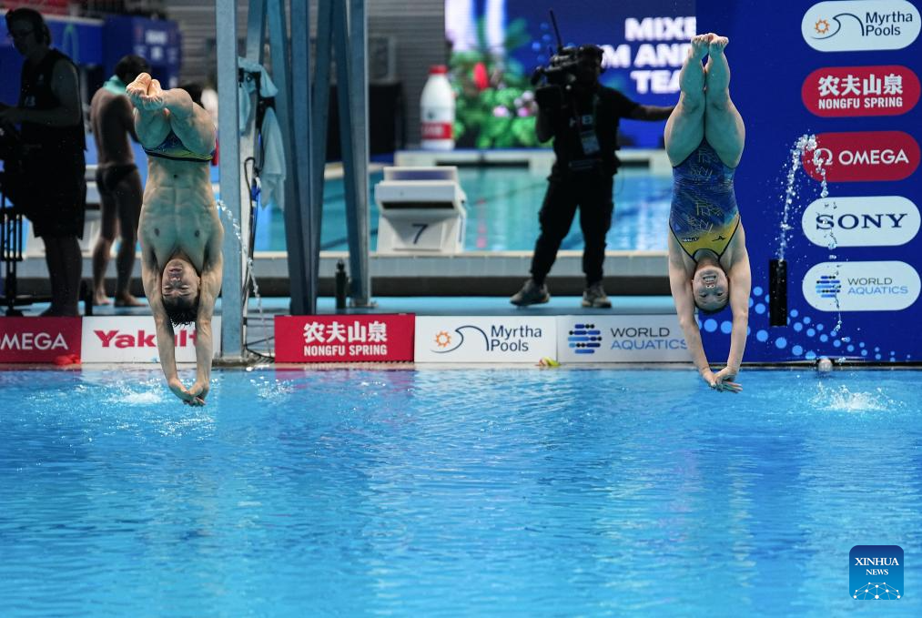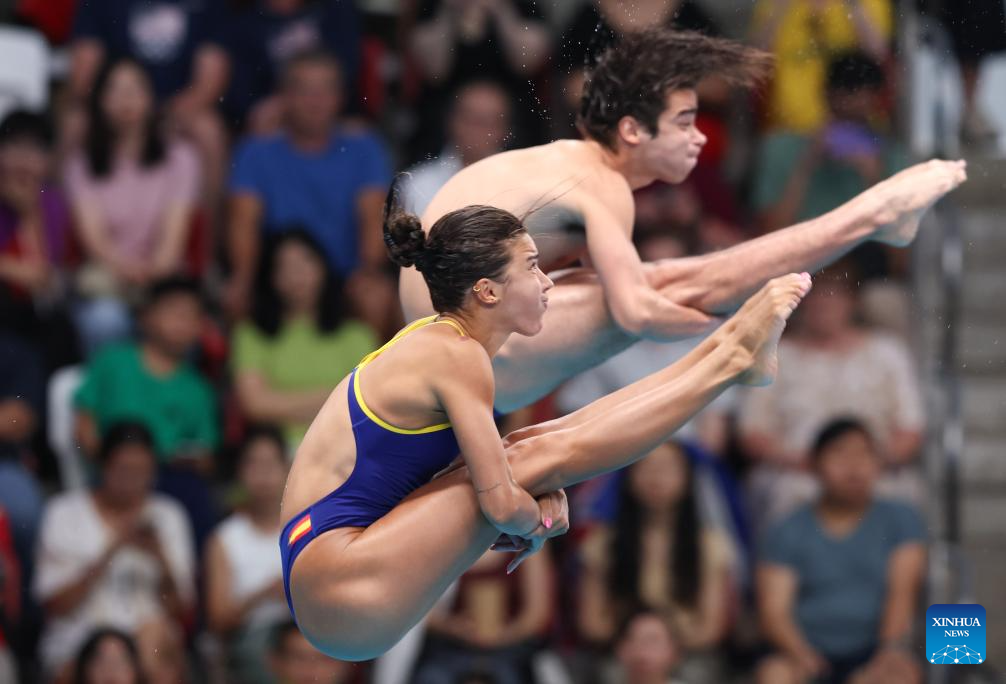 Valeria Antolino (front)/Jorge Rodriguez Ledesma of Spain compete during mixed 3m & 10m team final of diving at the World Aquatics Championships in Singapore, July 26, 2025. (Xinhua/Luo Yuan)