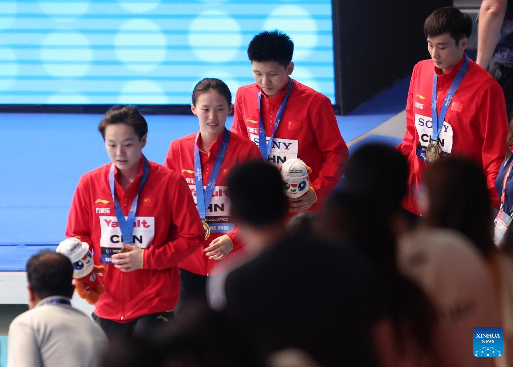 Gold medalists Team China react during the awarding ceremony for the mixed 3m & 10m team of diving at the World Aquatics Championships in Singapore, July 26, 2025. (Xinhua/Luo Yuan)