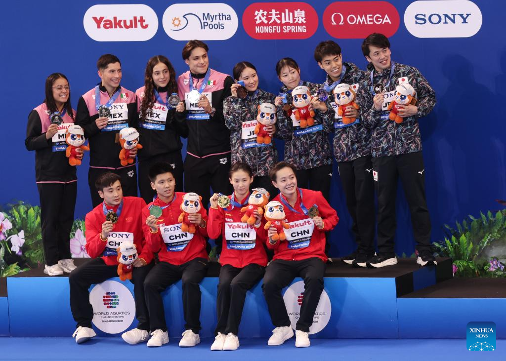 Gold medalists Team China (bottom), silver medalists Team Mexico (top L) and bronze medalists Team Japan pose for photo during the awarding ceremony for the mixed 3m & 10m team of diving at the World Aquatics Championships in Singapore, July 26, 2025. (Xinhua/Luo Yuan)