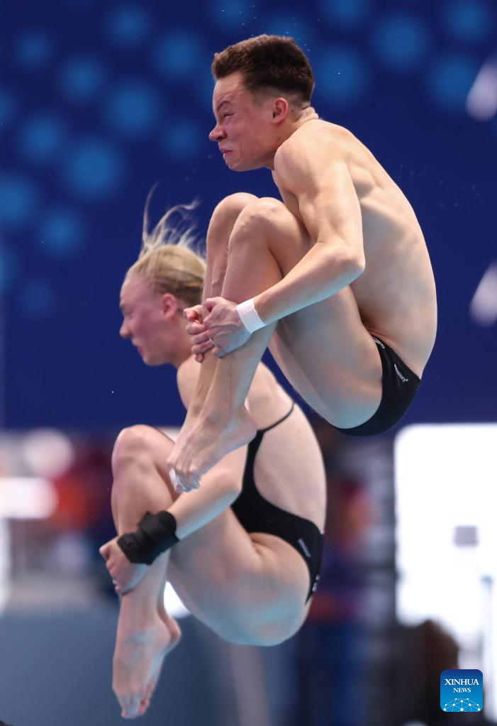 Ole Johannes Rosler (front) /Pauline Alexandra Preif of Germany compete during mixed 3m & 10m team final of diving at the World Aquatics Championships in Singapore, July 26, 2025. (Xinhua/Luo Yuan)
