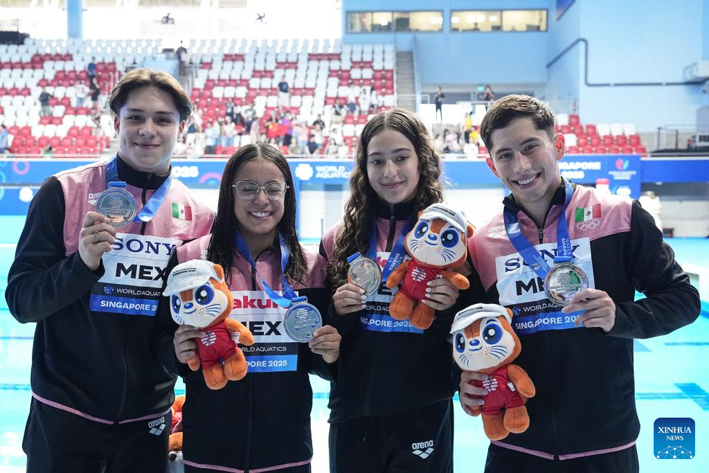 Silver medalists Team Mexico pose for photo after the awarding ceremony for the mixed 3m & 10m team of diving at the World Aquatics Championships in Singapore, July 26, 2025. (Xinhua/Xue Yuge)