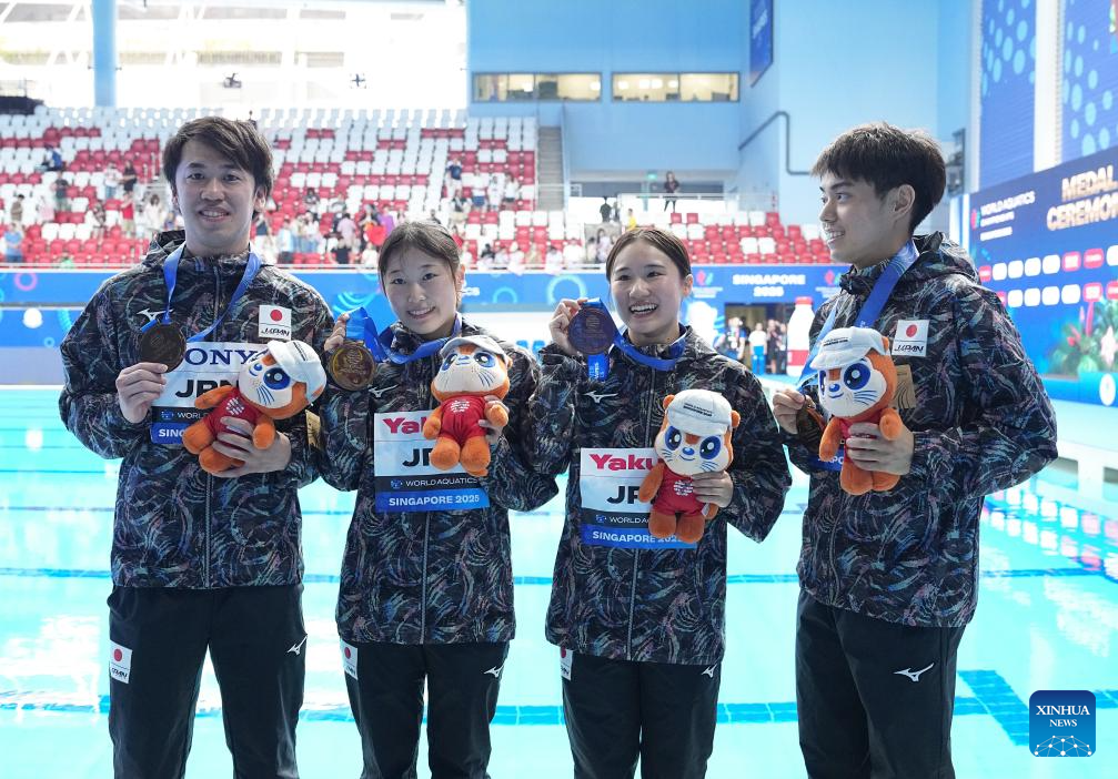 Bronze medalists Team Japan pose for photo after the awarding ceremony for the mixed 3m & 10m team of diving at the World Aquatics Championships in Singapore, July 26, 2025. (Xinhua/Xue Yuge)