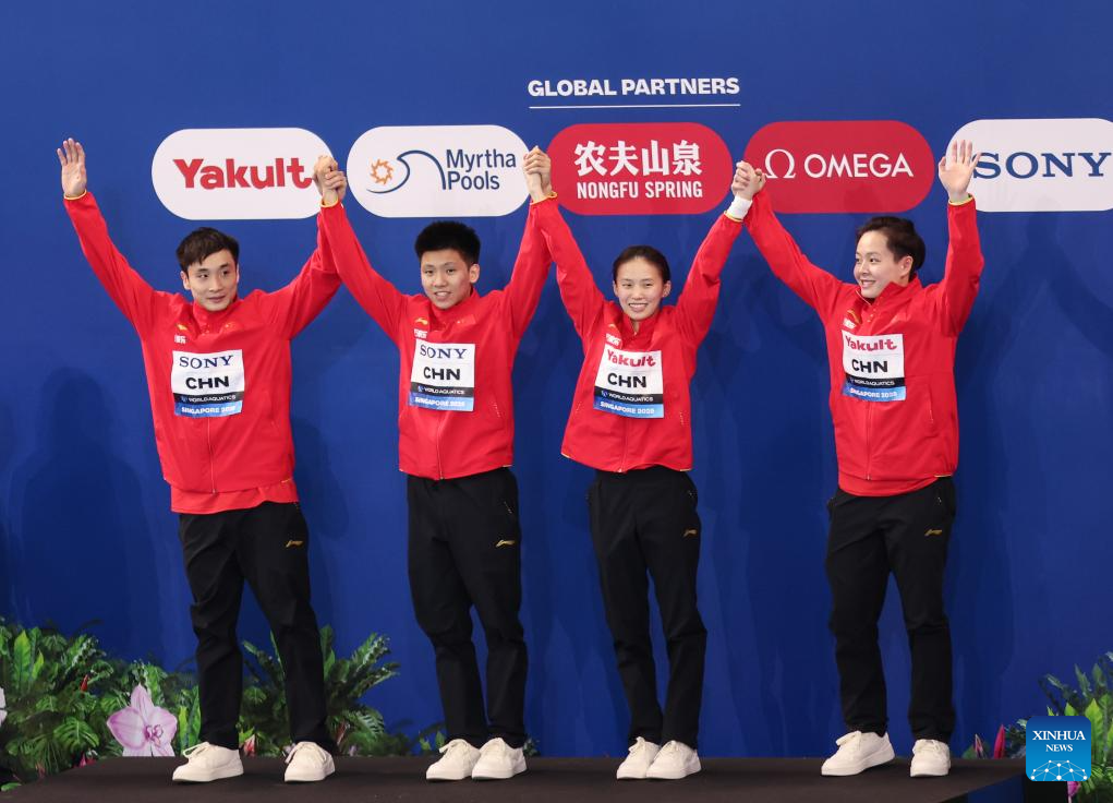 Gold medalists Team China react after the mixed 3m & 10m team final of diving at the World Aquatics Championships in Singapore, July 26, 2025. (Xinhua/Luo Yuan)