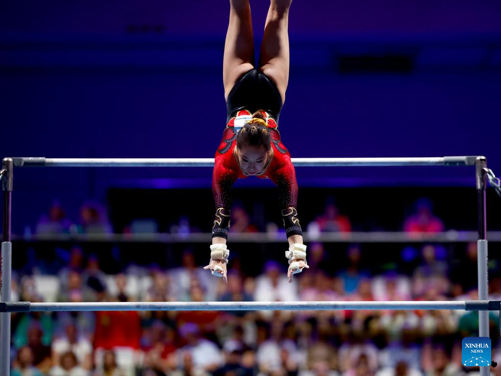 Xiang Lulu of China competes on uneven bars during the women's all-around final of the artistic gymnastics event at the Rhine-Ruhr 2025 FISU World University Games in Essen, Germany, July 25, 2025. (Xinhua/Li Ying)