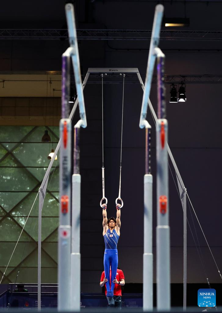 Hashimoto Daiki of Japan competes on the rings during the men's all-around final of artistic gymnastics at the Rhine-Ruhr 2025 FISU World University Games in Essen, Germany, July 25, 2025. (Xinhua/Hu Xingyu)