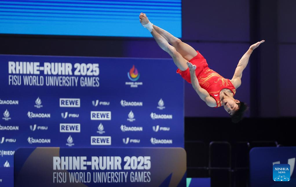 He Xiang of China competes on the floor exercise during the men's all-around final of artistic gymnastics at the Rhine-Ruhr 2025 FISU World University Games in Essen, Germany, July 25, 2025. (Xinhua/Hu Xingyu)