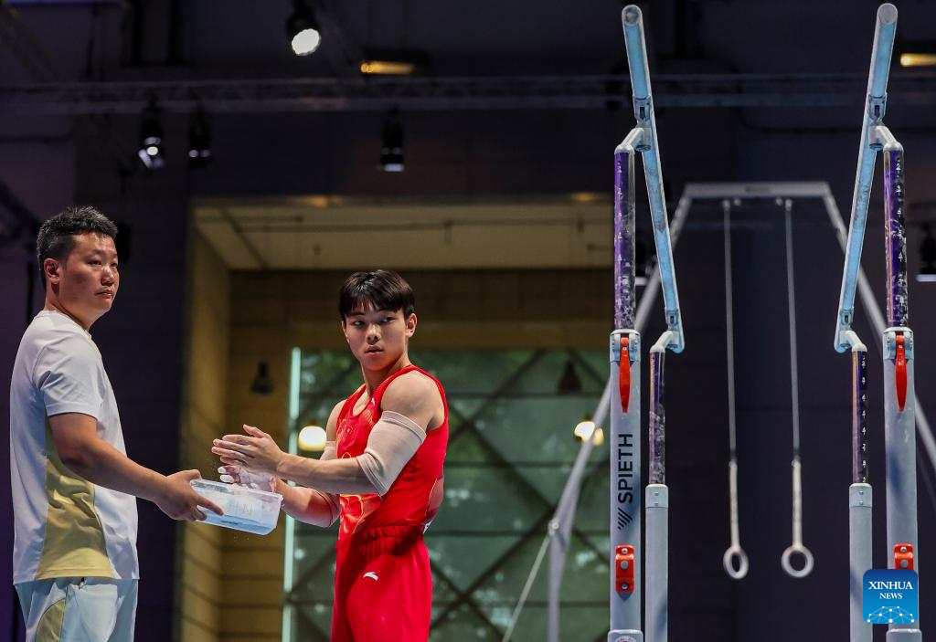 He Xiang (R) of China gets prepared with his coach Wu Xiang during the men's all-around final of artistic gymnastics at the Rhine-Ruhr 2025 FISU World University Games in Essen, Germany, July 25, 2025. (Xinhua/Hu Xingyu)