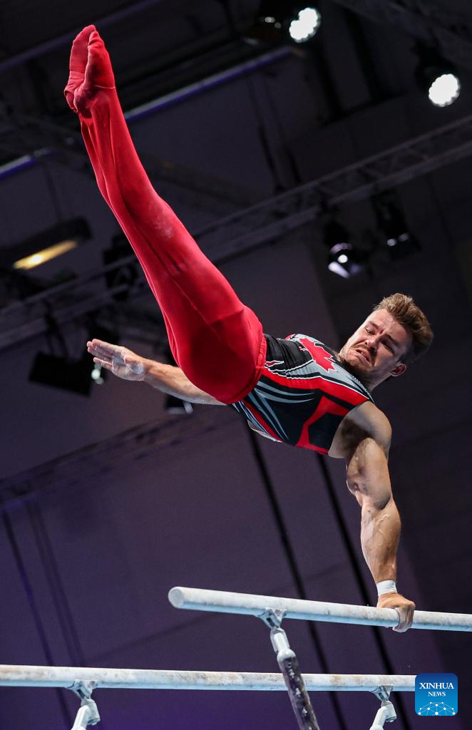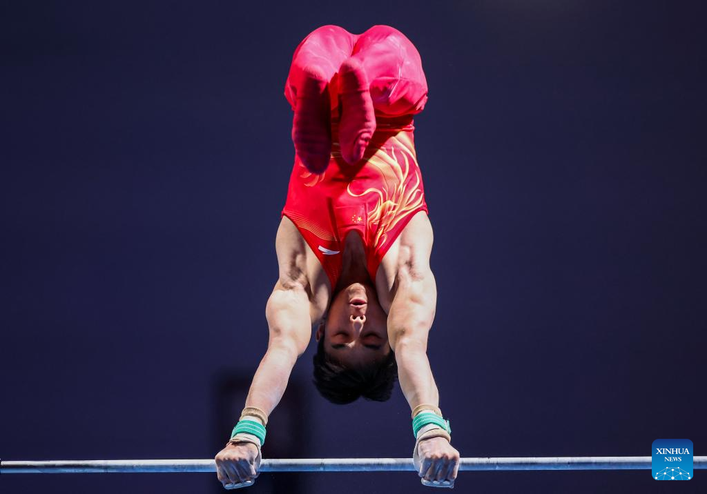 He Xiang of China competes on the parallel bars during the men's all-around final of artistic gymnastics at the Rhine-Ruhr 2025 FISU World University Games in Essen, Germany, July 25, 2025. (Xinhua/Hu Xingyu)