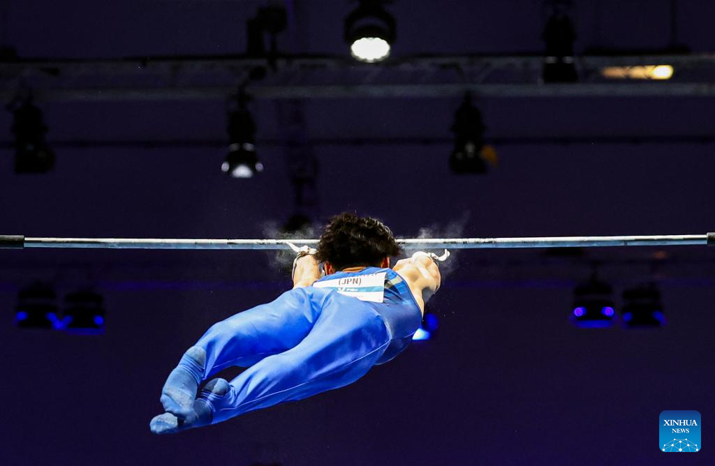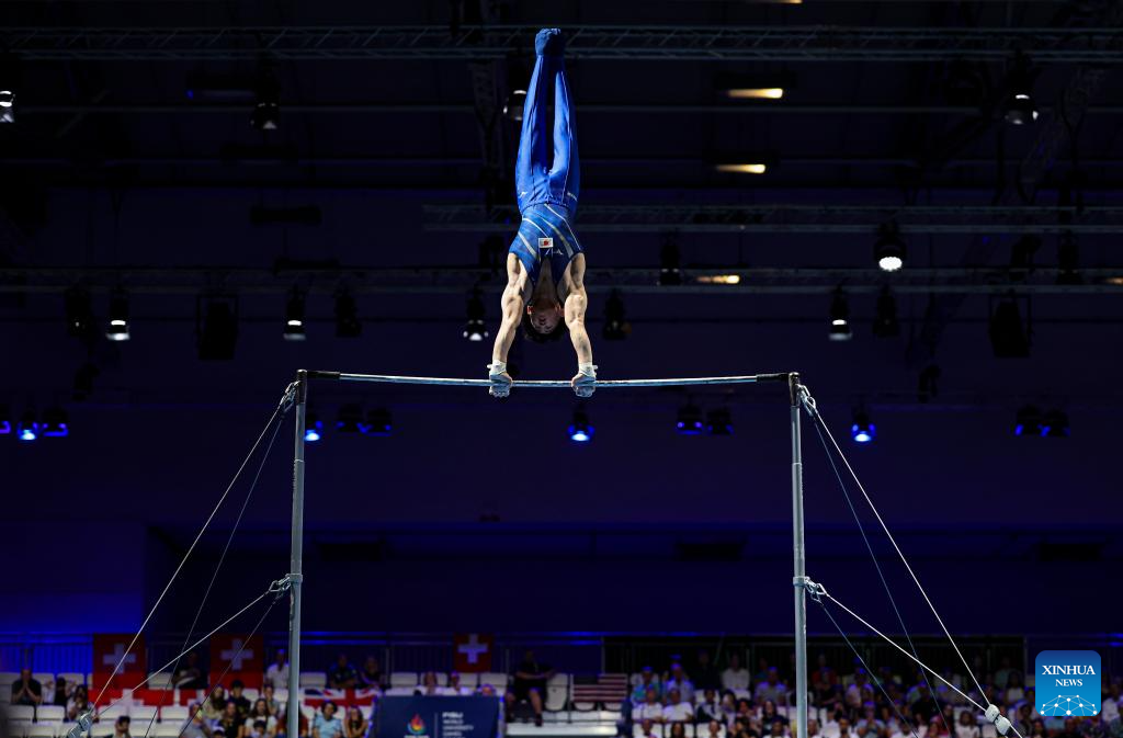 Hashimoto Daiki of Japan competes on the horizontal bar the during the men's all-around final of artistic gymnastics at the Rhine-Ruhr 2025 FISU World University Games in Essen, Germany, July 25, 2025. (Xinhua/Hu Xingyu)