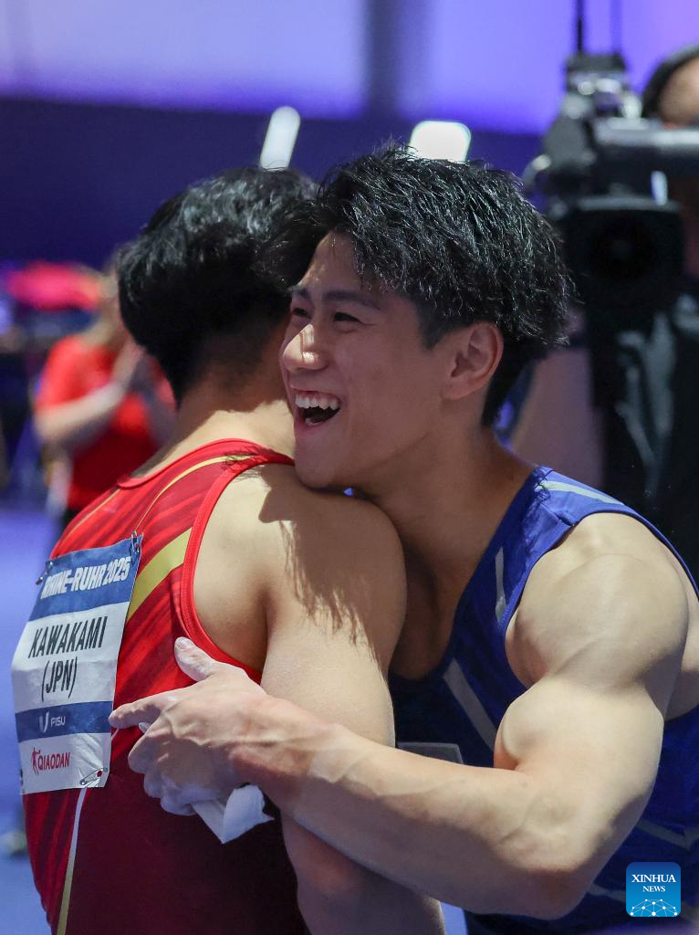 Gold medalist Hashimoto Daiki (R) of Japan hugs teammate silver medalist Kawakami Shohei after the men's all-around final of artistic gymnastics at the Rhine-Ruhr 2025 FISU World University Games in Essen, Germany, July 25, 2025. (Xinhua/Hu Xingyu)
