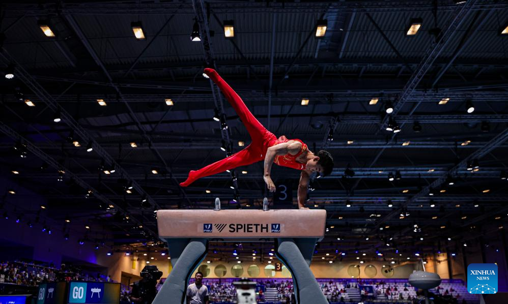 He Xiang of China competes on the pommel horse during the men's all-around final of artistic gymnastics at the Rhine-Ruhr 2025 FISU World University Games in Essen, Germany, July 25, 2025. (Xinhua/Hu Xingyu)