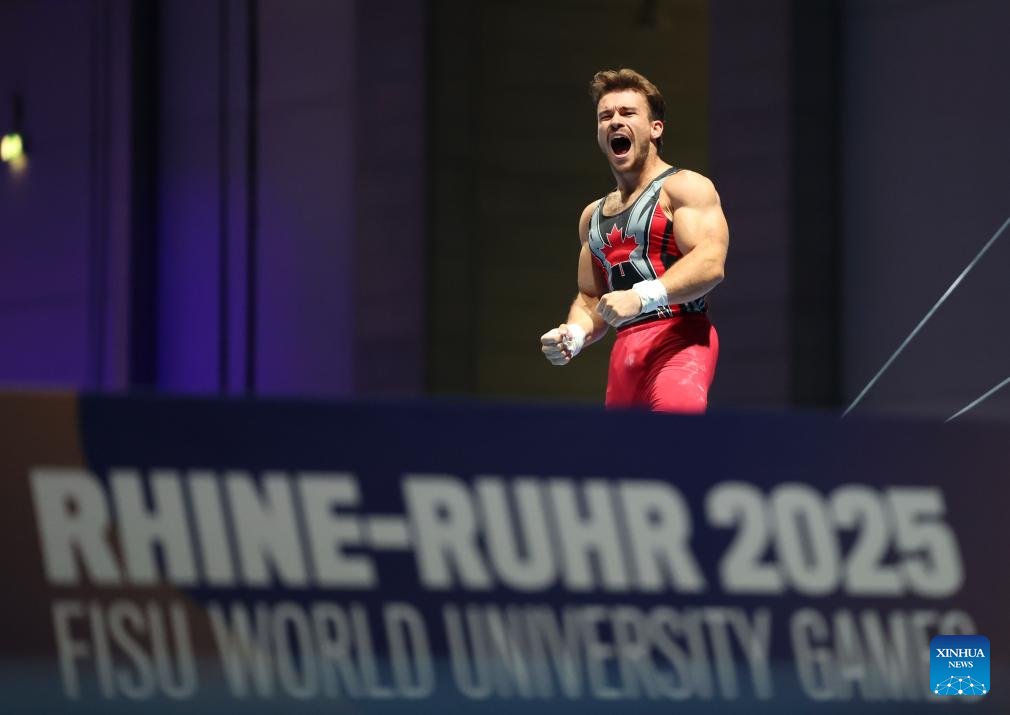 William Emard of Canada celebrates after the men's all-around final of artistic gymnastics at the Rhine-Ruhr 2025 FISU World University Games in Essen, Germany, July 25, 2025. (Xinhua/Hu Xingyu)