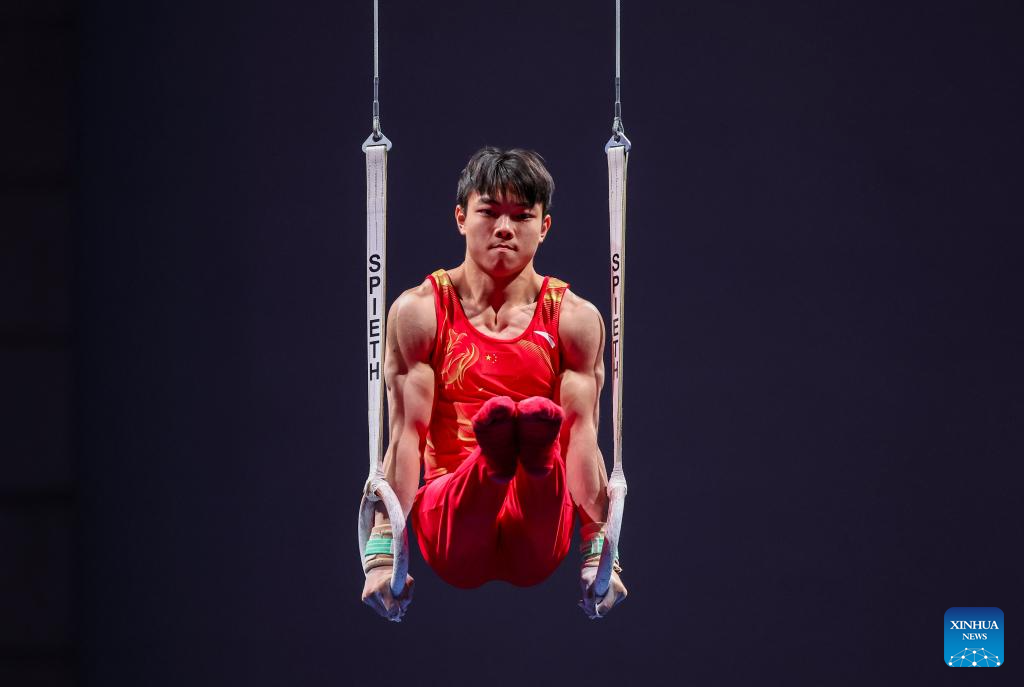 He Xiang of China competes on the rings during the men's all-around final of artistic gymnastics at the Rhine-Ruhr 2025 FISU World University Games in Essen, Germany, July 25, 2025. (Xinhua/Hu Xingyu)