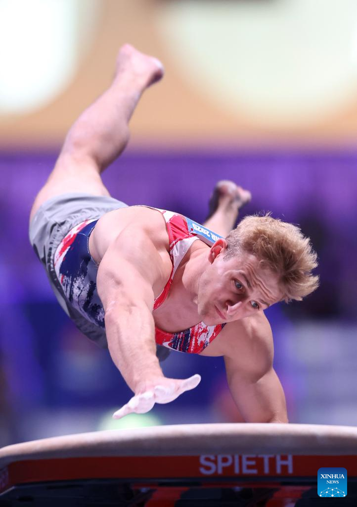 Colt Walker of the United States competes on the vault during the men's all-around final of artistic gymnastics at the Rhine-Ruhr 2025 FISU World University Games in Essen, Germany, July 25, 2025. (Xinhua/Hu Xingyu)