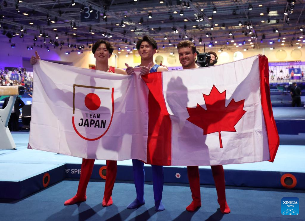 Gold medalist Hashimoto Daiki (C) of Japan, silver medalist Kawakami Shohei of Japan (L) and bronze medalist William Emard of Canada pose for photos after the men's all-around final of artistic gymnastics at the Rhine-Ruhr 2025 FISU World University Games in Essen, Germany, July 25, 2025. (Xinhua/Hu Xingyu)