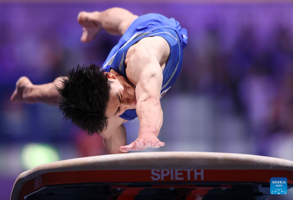 Hashimoto Daiki of Japan competes on the vault during the men's all-around final of artistic gymnastics at the Rhine-Ruhr 2025 FISU World University Games in Essen, Germany, July 25, 2025. (Xinhua/Hu Xingyu)