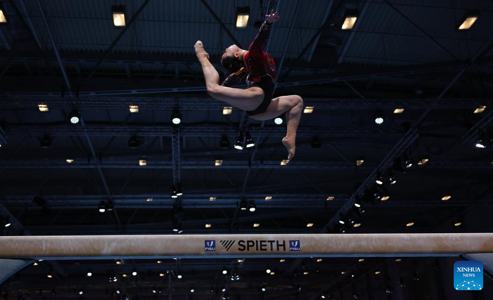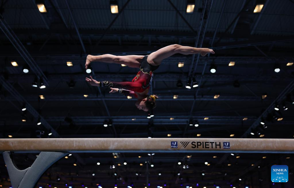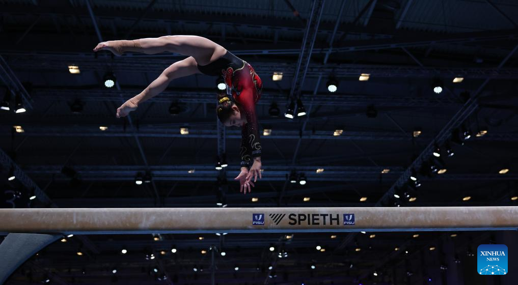 Xiang Lulu of China competes on balance beam during the women's all-around final of the artistic gymnastics event at the Rhine-Ruhr 2025 FISU World University Games in Essen, Germany, July 25, 2025. (Xinhua/Li Ying)