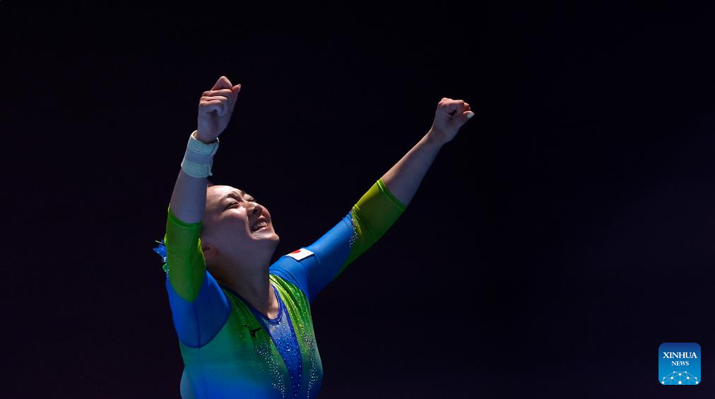 Miyata Shoko of Japan celebrates after floor exercise during the women's all-around final of the artistic gymnastics event at the Rhine-Ruhr 2025 FISU World University Games in Essen, Germany, July 25, 2025. (Xinhua/Li Ying)
