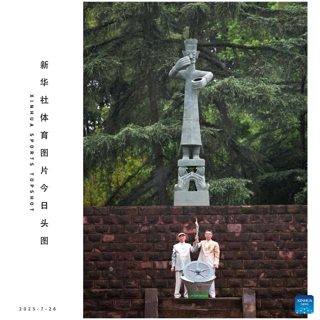 Xiao Xianjin (L), representative of Sanxingdui Museum, and Zhu Zhangyi, representative of Jinsha Site Museum, display the flame during the flame lighting ceremony before the World Games 2025 Torch Relay in Deyang, southwest China's Sichuan Province, on July 26, 2025. (Xinhua/Liu Kun)