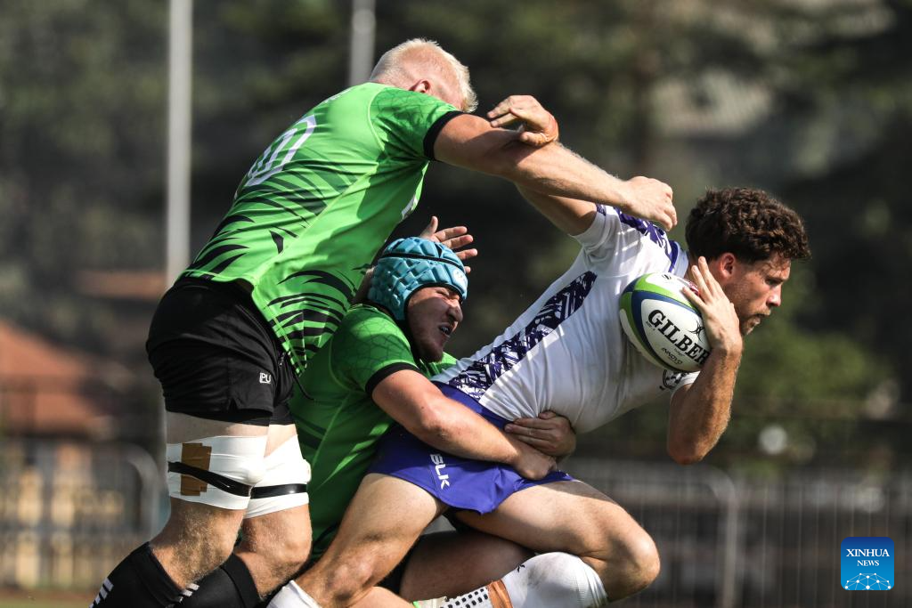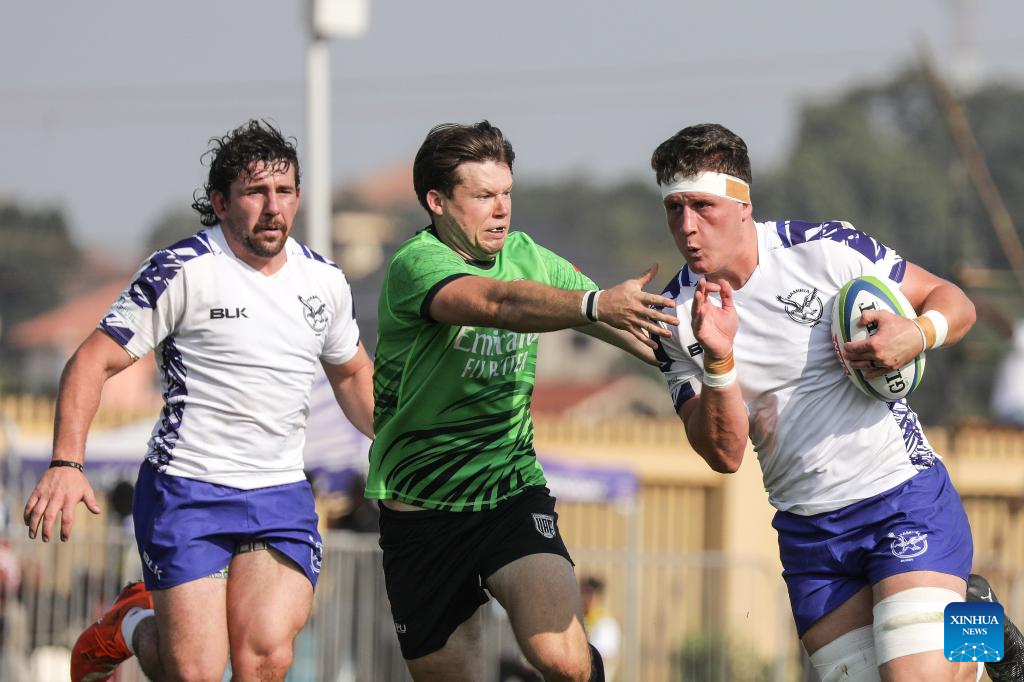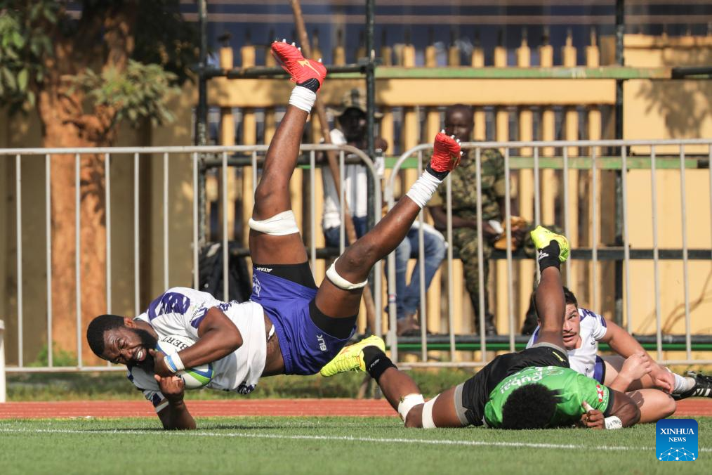 Andre Van Der Berg (R) of Namibia carries the ball during the Asia/Africa play-off match between Namibia and United Arab Emirates for the 2027 Rugby World Cup qualifiers at Mandela National Stadium in Kampala, Uganda, July 26, 2025. (Photo by Hajarah Nalwadda/Xinhua)