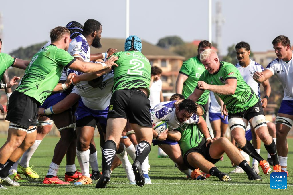 Players of Namibia (white) and United Arab Emirates (green) vie for the ball during the Asia/Africa play-off match between Namibia and United Arab Emirates for the 2027 Rugby World Cup qualifiers at Mandela National Stadium in Kampala, Uganda, July 26, 2025. (Photo by Hajarah Nalwadda/Xinhua)