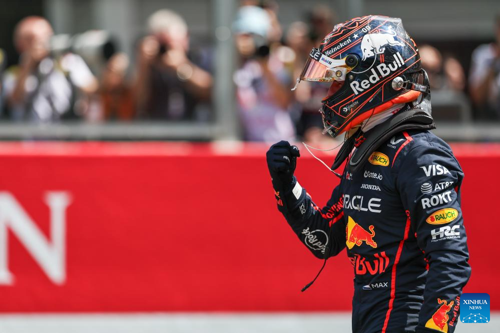 Red Bull Racing's Dutch driver Max Verstappen celebrates after the Sprint Race of the Formula One Belgian Grand Prix at the Spa-Francorchamps circuit in Stavelot, Belgium, July 26, 2025. (Photo by Qian Jun/Xinhua)