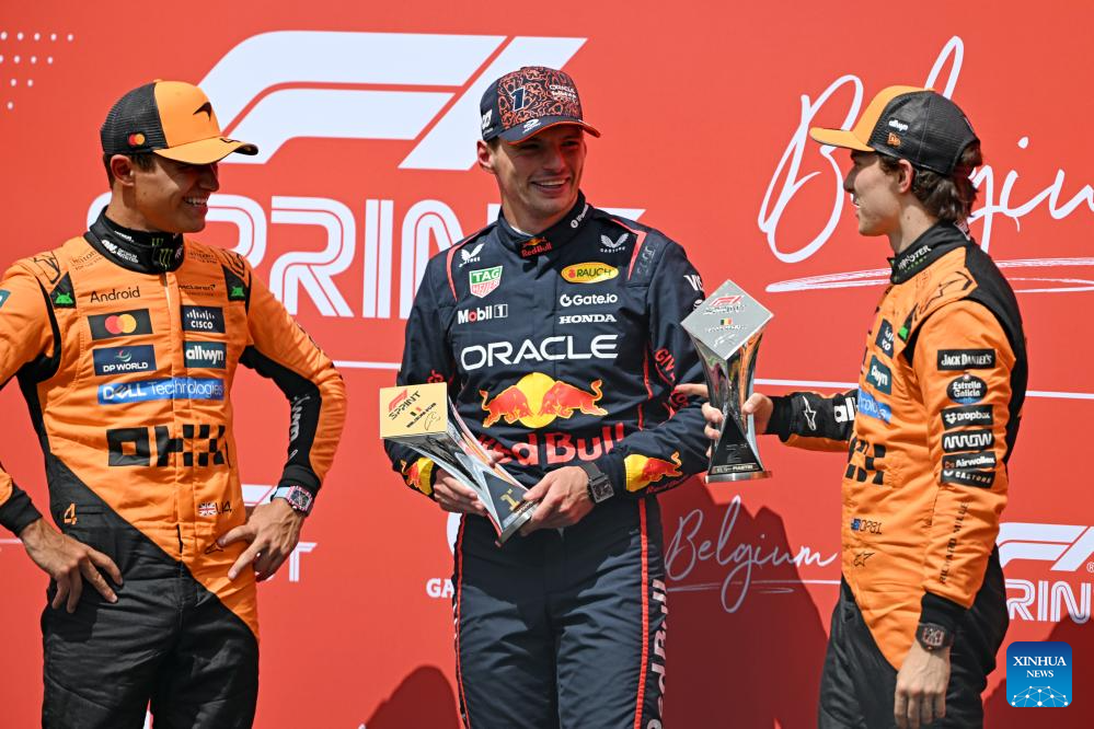 Red Bull Racing's Dutch driver Max Verstappen (C), McLaren's Australian driver Oscar Piastri (R) and McLaren's British driver Lando Norris react during the awarding ceremony for the Sprint Race of the Formula One Belgian Grand Prix at the Spa-Francorchamps circuit in Stavelot, Belgium, July 26, 2025. (Xinhua/Zhao Dingzhe)