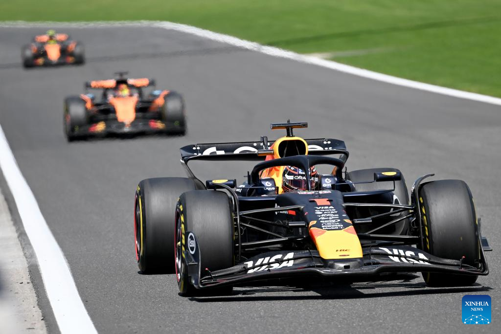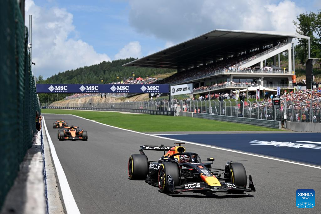 Red Bull Racing's Dutch driver Max Verstappen (front) races during the Sprint Race of the Formula One Belgian Grand Prix at the Spa-Francorchamps circuit in Stavelot, Belgium, July 26, 2025. (Xinhua/Zhao Dingzhe)