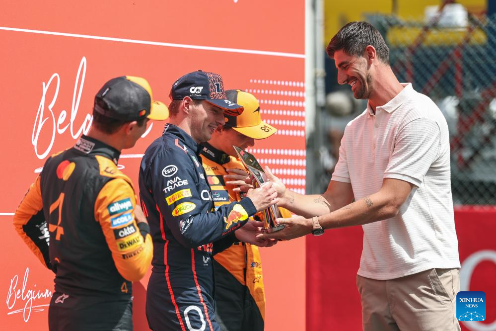 Red Bull's Max Verstappen (2nd L) is awarded a trophy by Belgian goalkeeper Thibaut Courtois (R) after winning the Sprint Race of the Formula One Belgian Grand Prix at the Spa-Francorchamps circuit in Stavelot, Belgium, July 26, 2025. (Photo by Qian Jun/Xinhua)